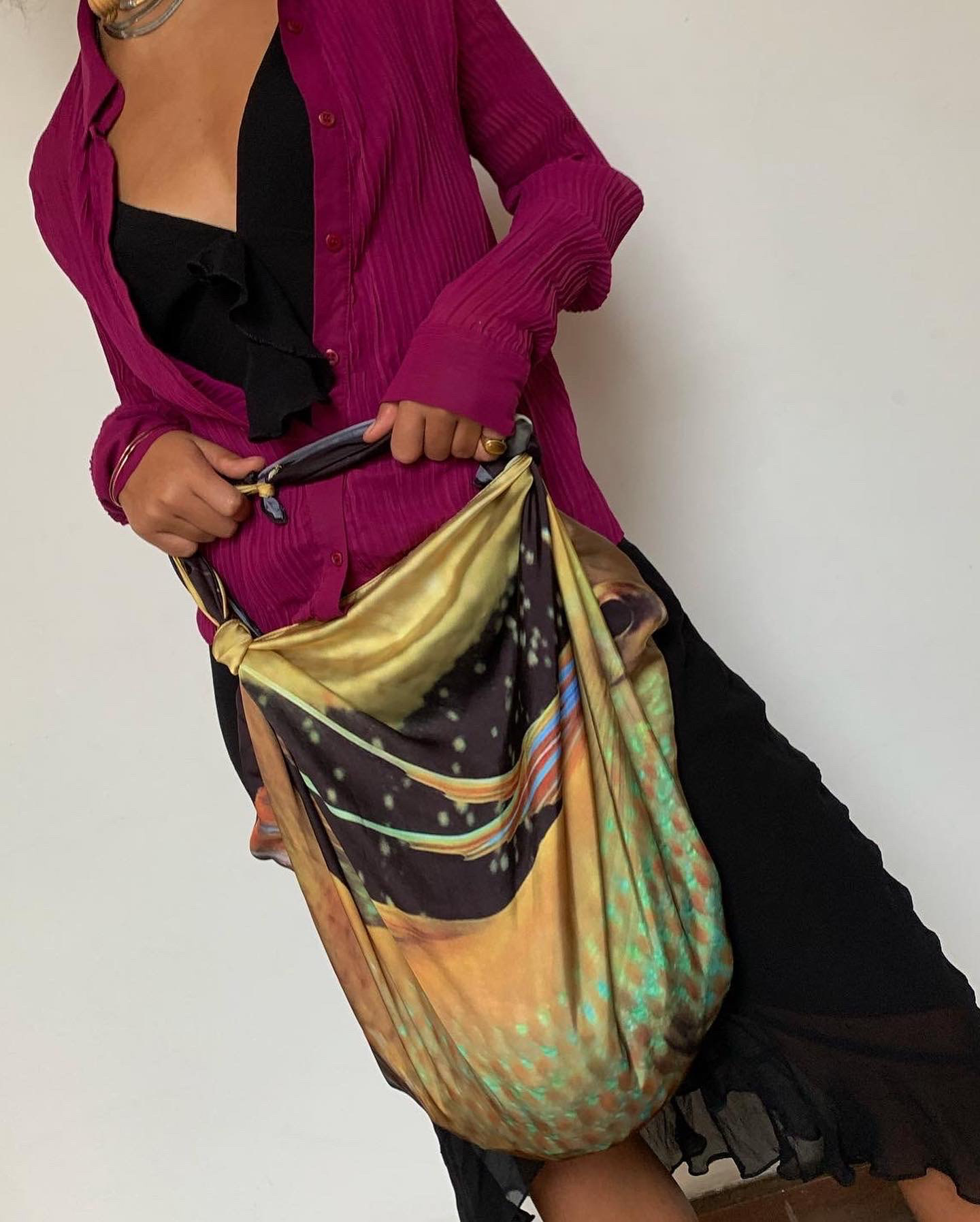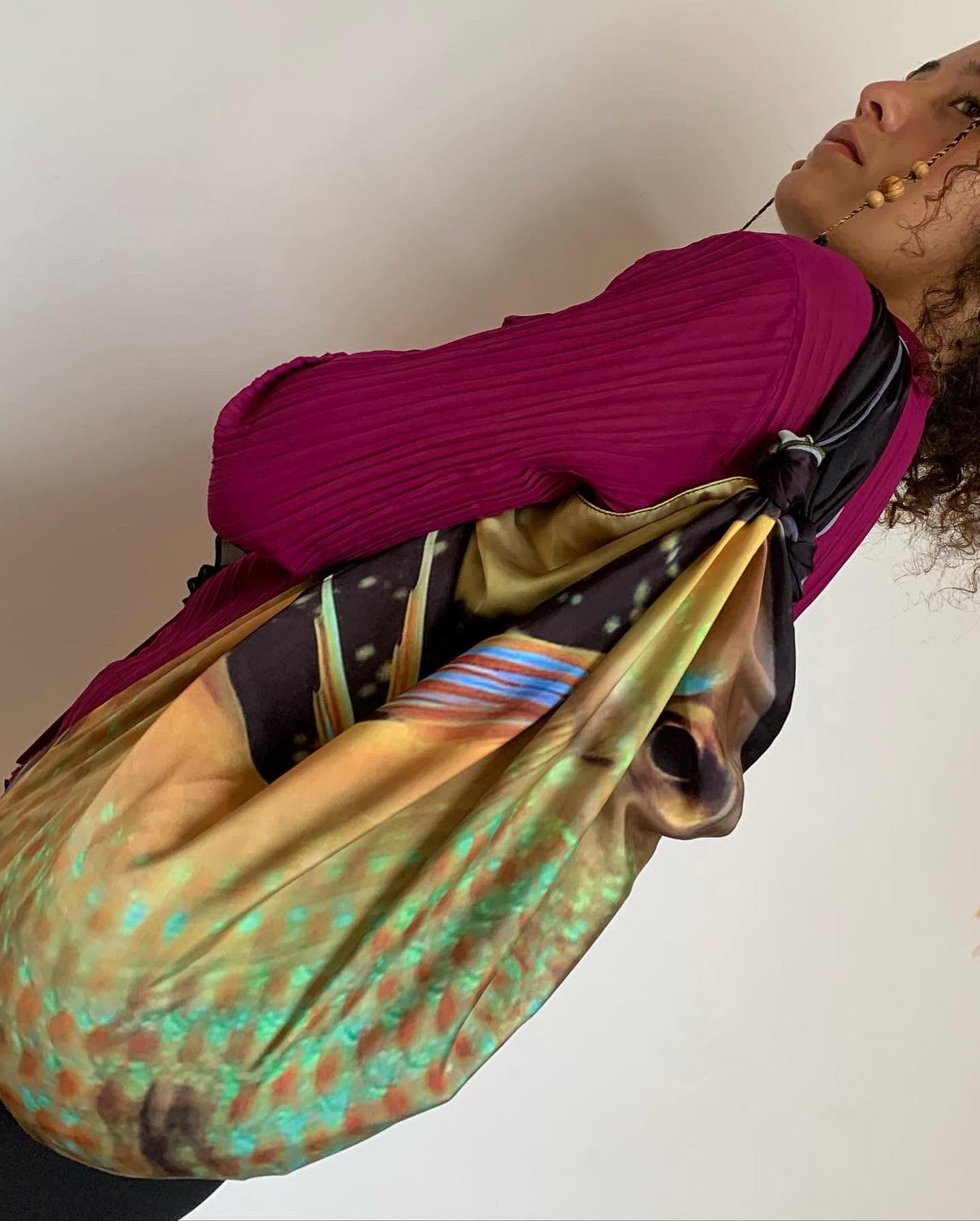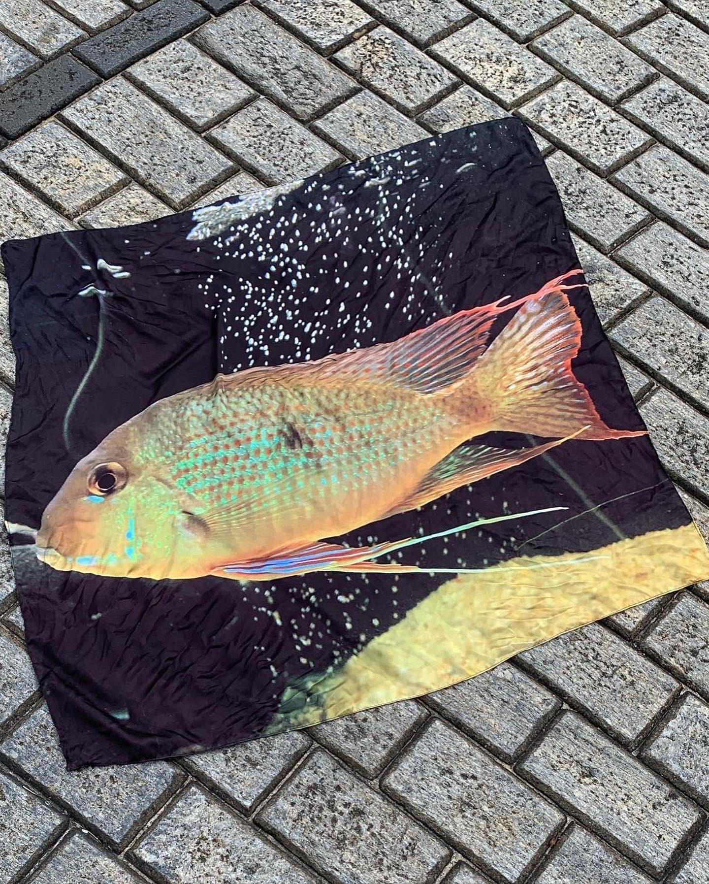 Os lenços peixe são trabalhos pensados a partir de registros fotográficos pessoais. Esses estudos são experimentos de impressões fotográficas em diferentes tipos de tecidos, Pensar a partir dessa arte impressa em maneiras de criar um adereço, uma veste. Um estudo sobre a versatilidade e a janela de possibilidades existentes a partir de um pedaço de tecido. Criação de bolsas com nós e amarrações, pareôs/ cangas, painéis decorativos de parede, adereços de cabeça e outros inúmeros enfeites. O Lenço é em seda satin, tecido extremamente leve e perolado desenvolvido para ser multiuso lenço bolsa, cabelo, corpo, parede. Dimensão de 95 cm x 95 cm. ꧁꧂